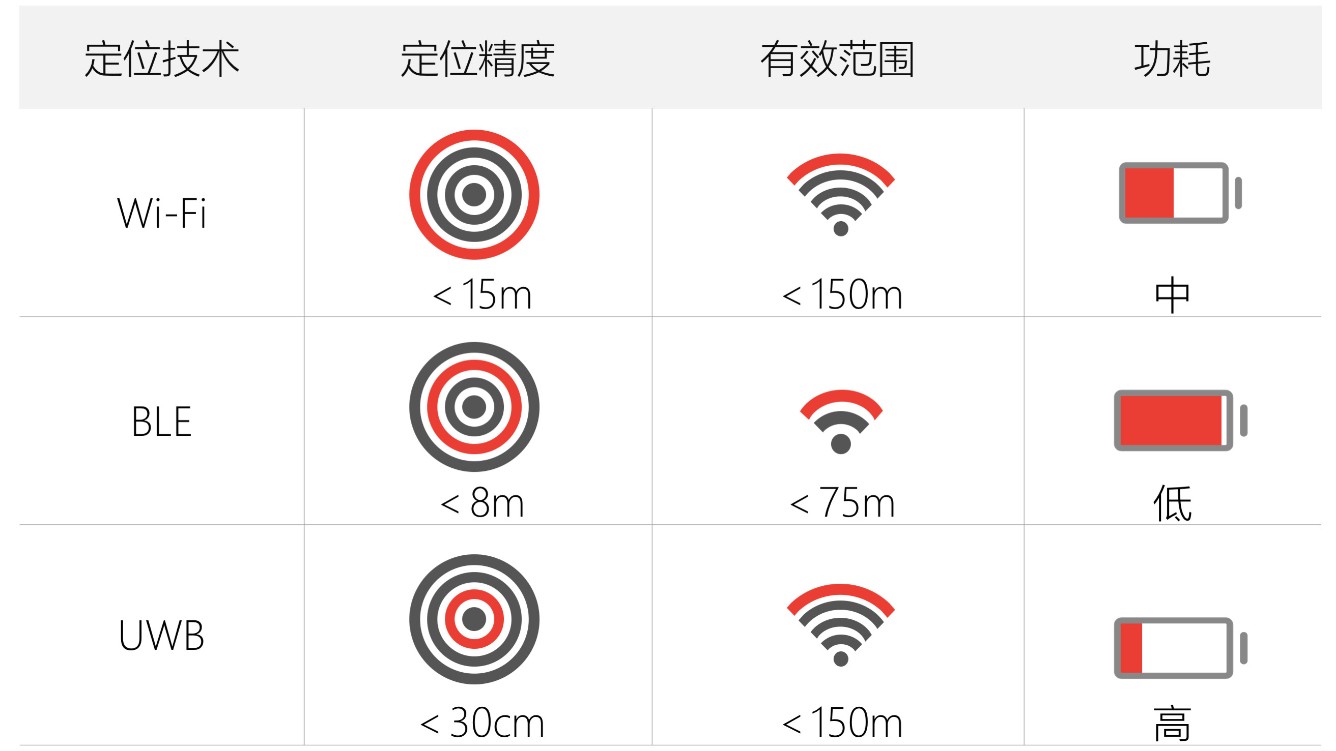 在定位精度方面UWB排名第一,可以達(dá)到30cm以內(nèi),其余技術(shù)的定位精度均在1m以上,遠(yuǎn)遠(yuǎn)低于UWB。同時(shí)在安全性,定位范圍等,UWB也是較高的。