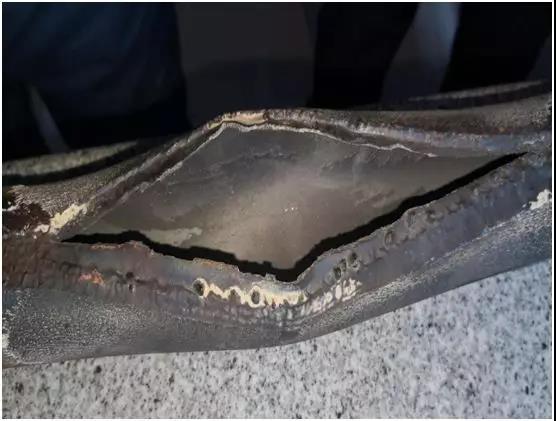 經過檢查后發(fā)現(xiàn),造成本次事故的原因是過熱器爆管。流過熱器低溫段左側第二屏前向后數(shù)第三根管爆管,爆口距頂棚約4米,爆口外表面有長約200mm、寬約10mm溝痕,厚度1mm溝痕,斷口大部分壁厚小于1毫米。斷管后進行通球未發(fā)現(xiàn)異物,調取2018年10月9日1號機組啟動以來壁溫及煙溫曲線,未發(fā)現(xiàn)超溫情況,該管段附近無吹灰器(排除吹灰器吹損原因)。由于管子爆口下部管段存在明顯減薄缺陷,且原因不清,為進一步分析查明爆管及管子減薄缺陷的形成原因,2月18日,將爆管管樣寄至熱工院進行檢測分析。